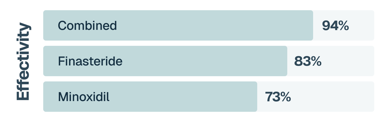 94% of men who use Finasteride and Minoxidil together experience significant improvement. Hair loss and growth is a gradual process; after 3-6 months, the first result is visible.